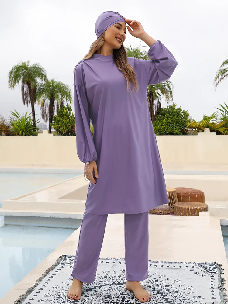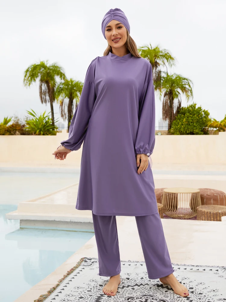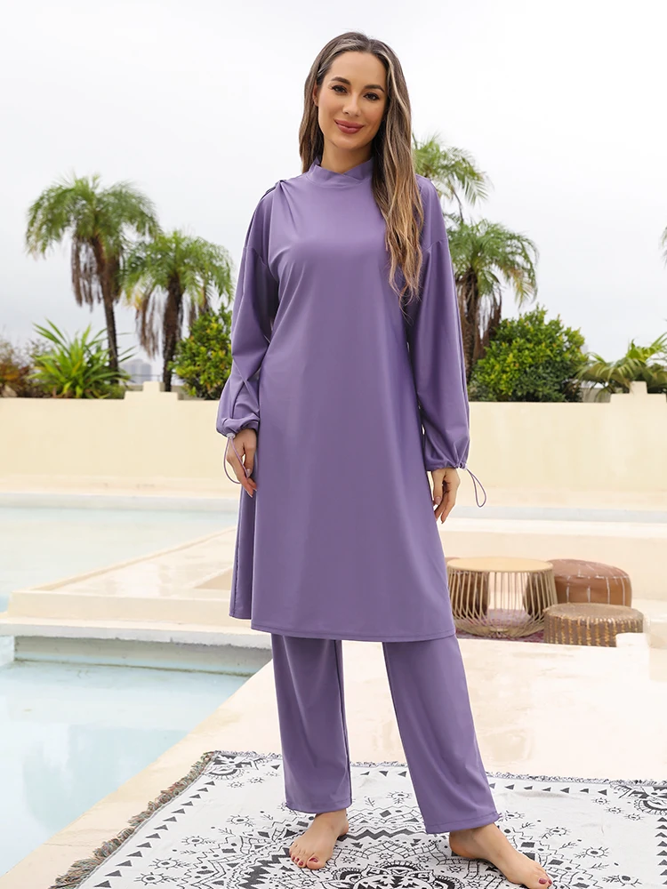 Long Sleeved Women’s Swimwear Three Piece Split Swimsuit Solid Color Sun Protection Long Pants Beach Outfit